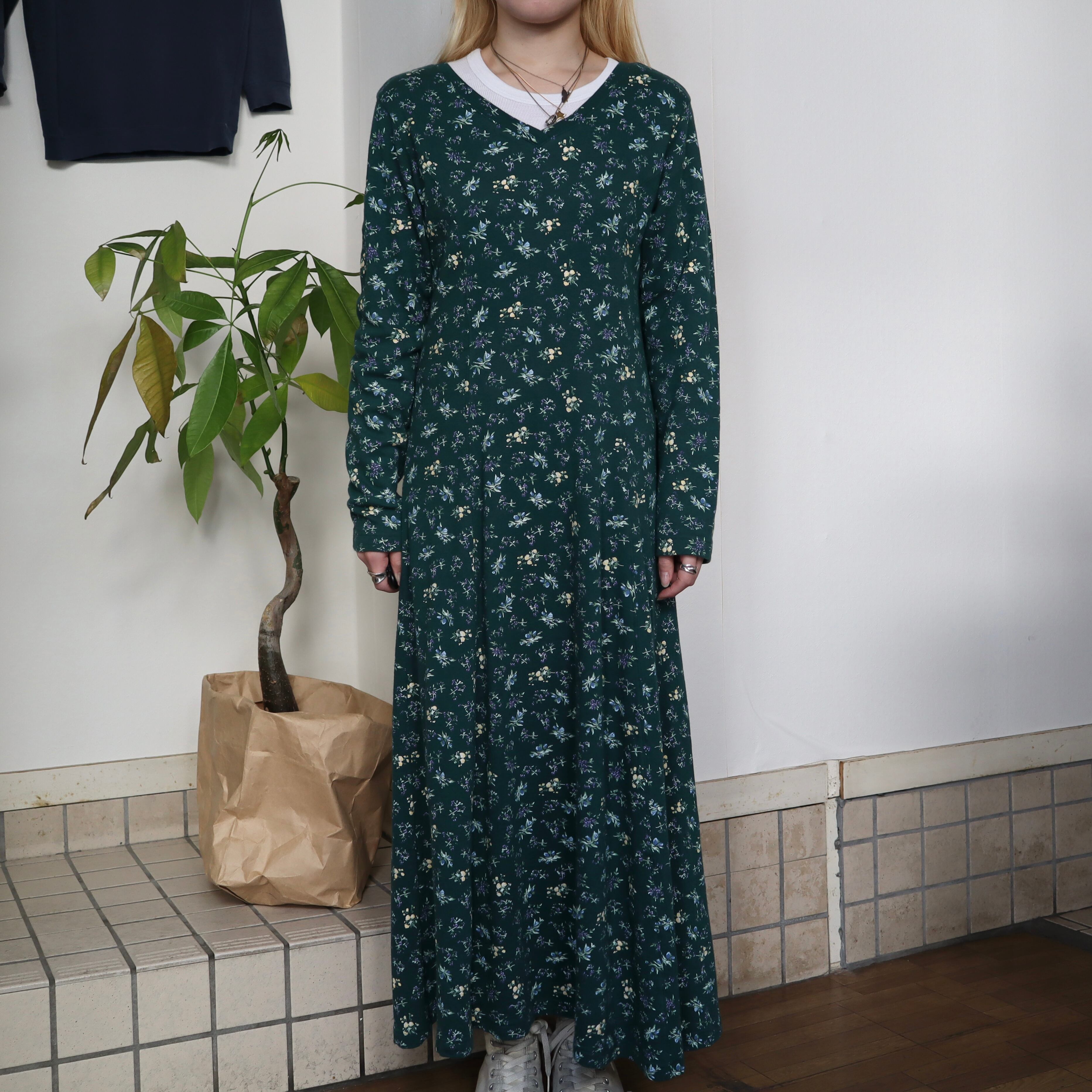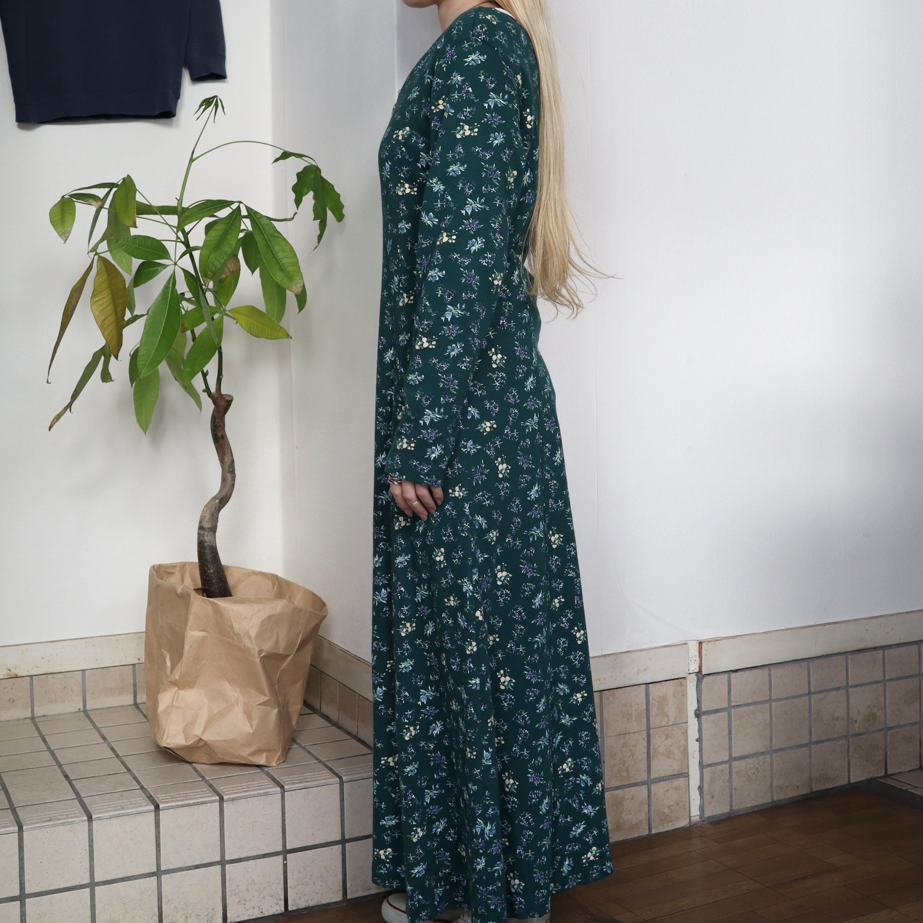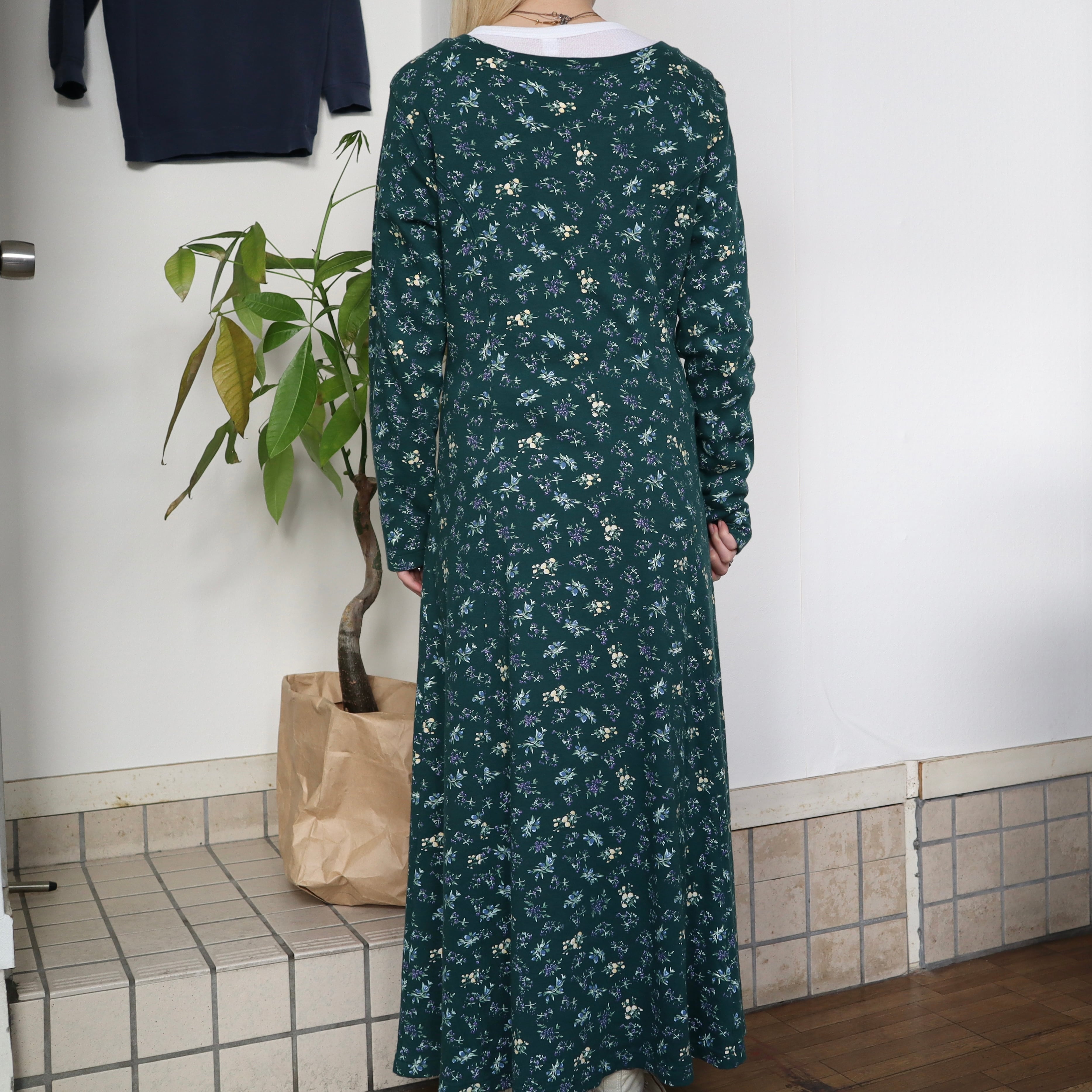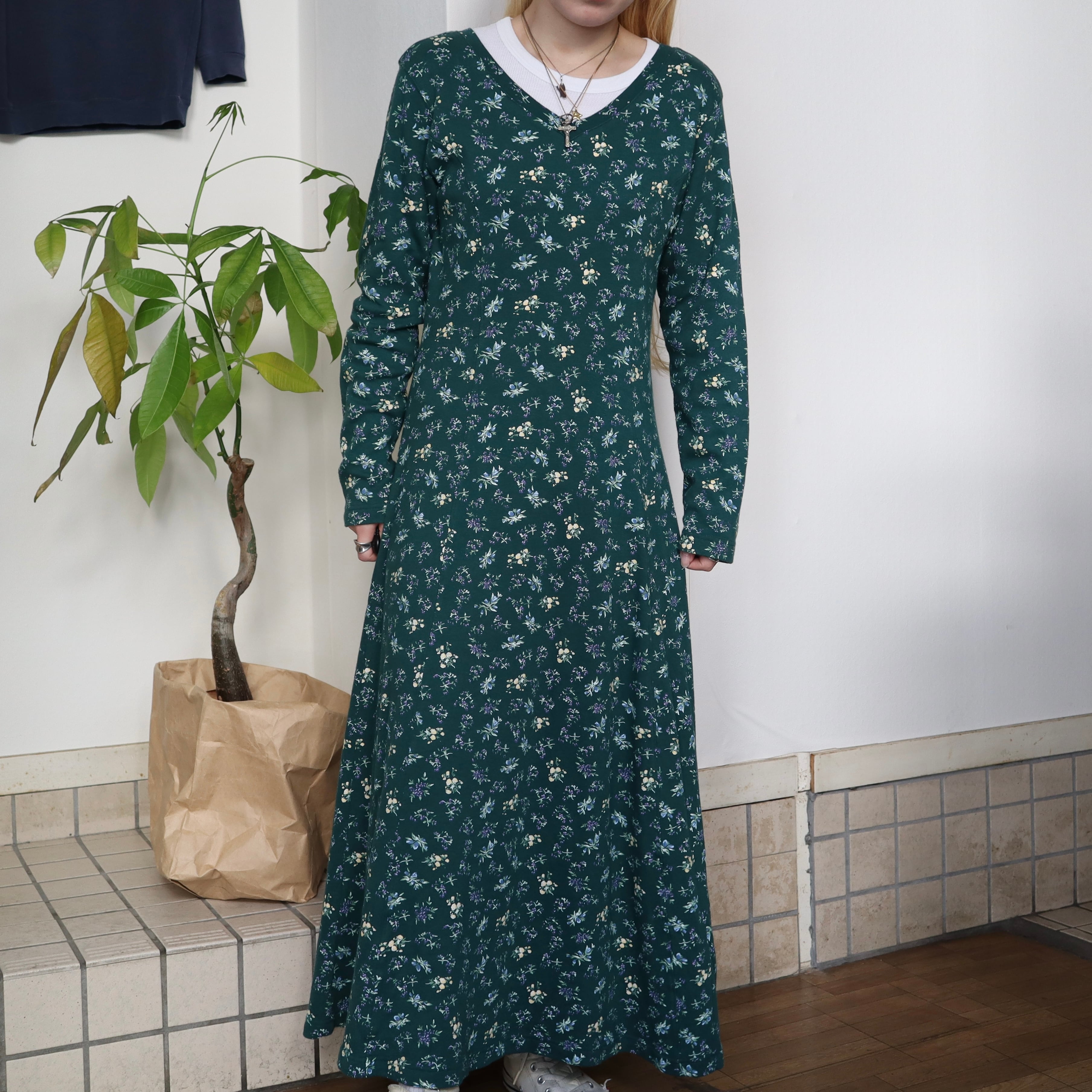 old flower long sleeve dress / green
