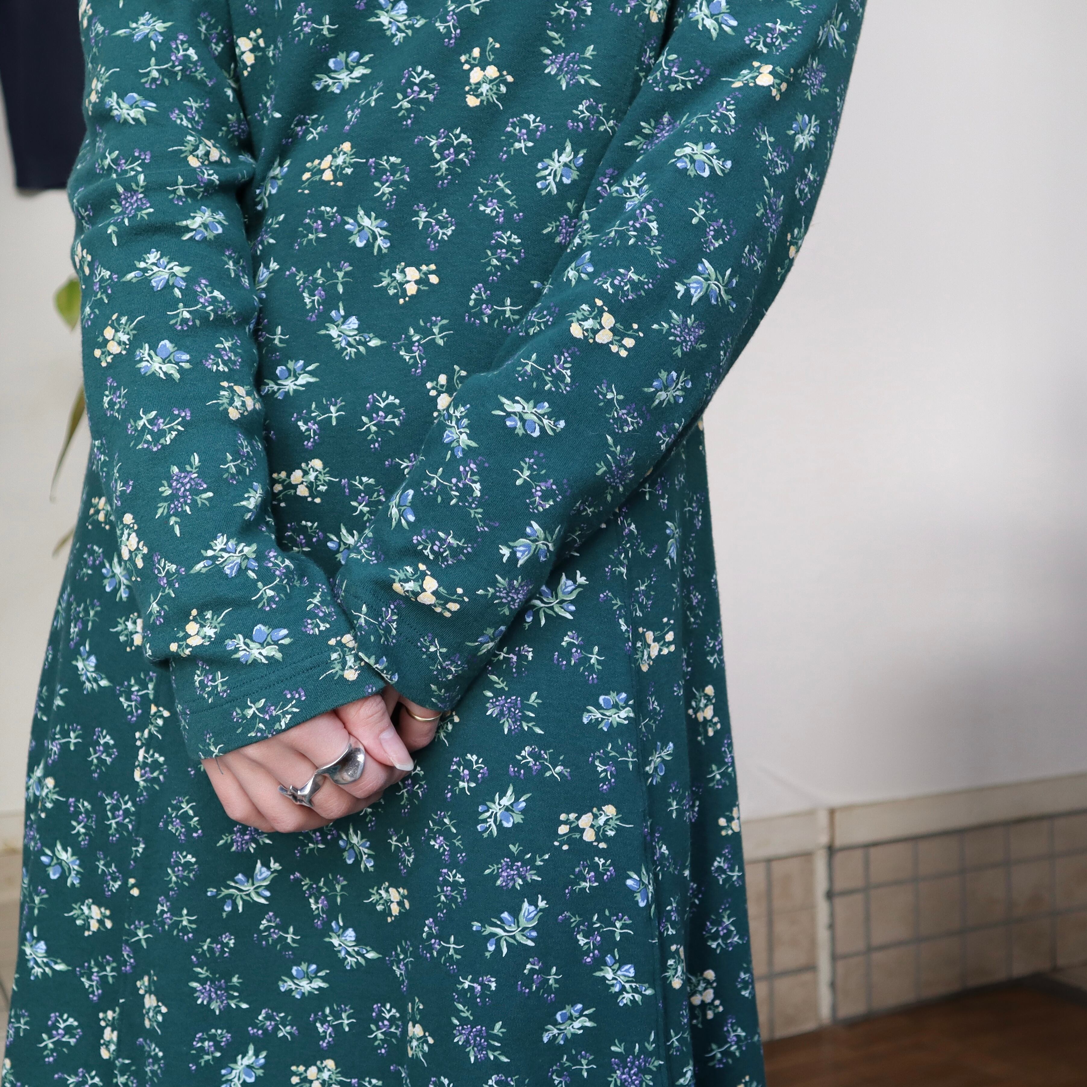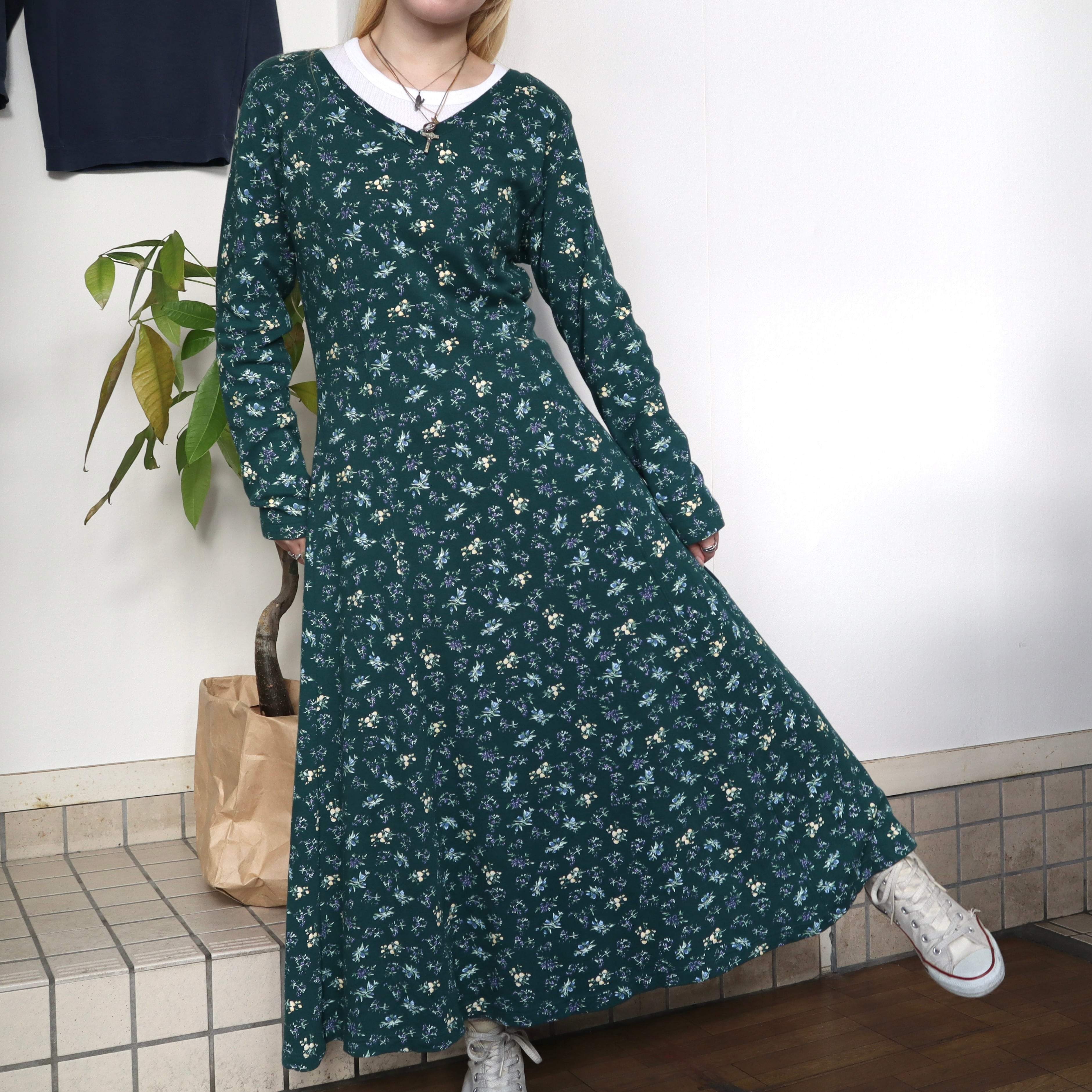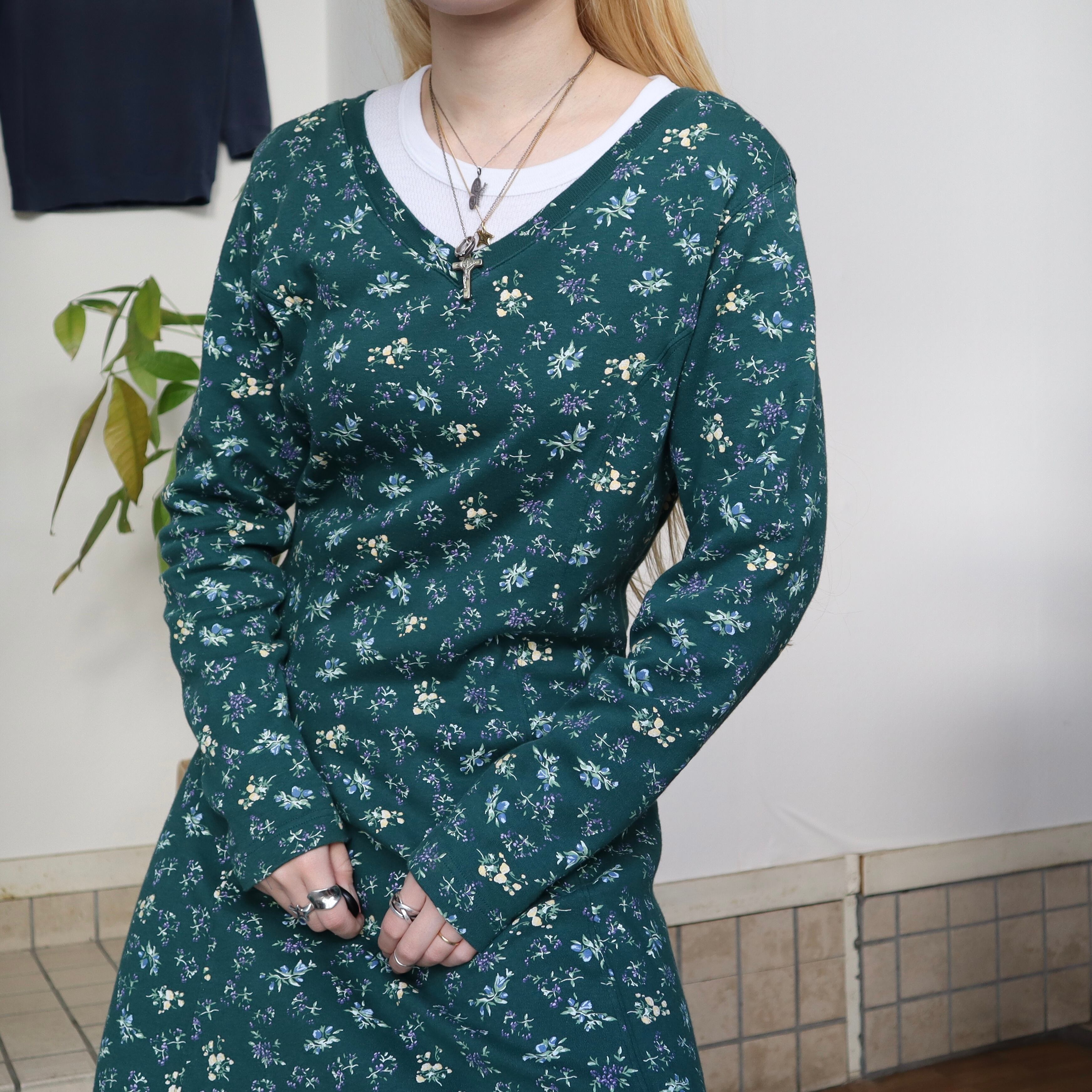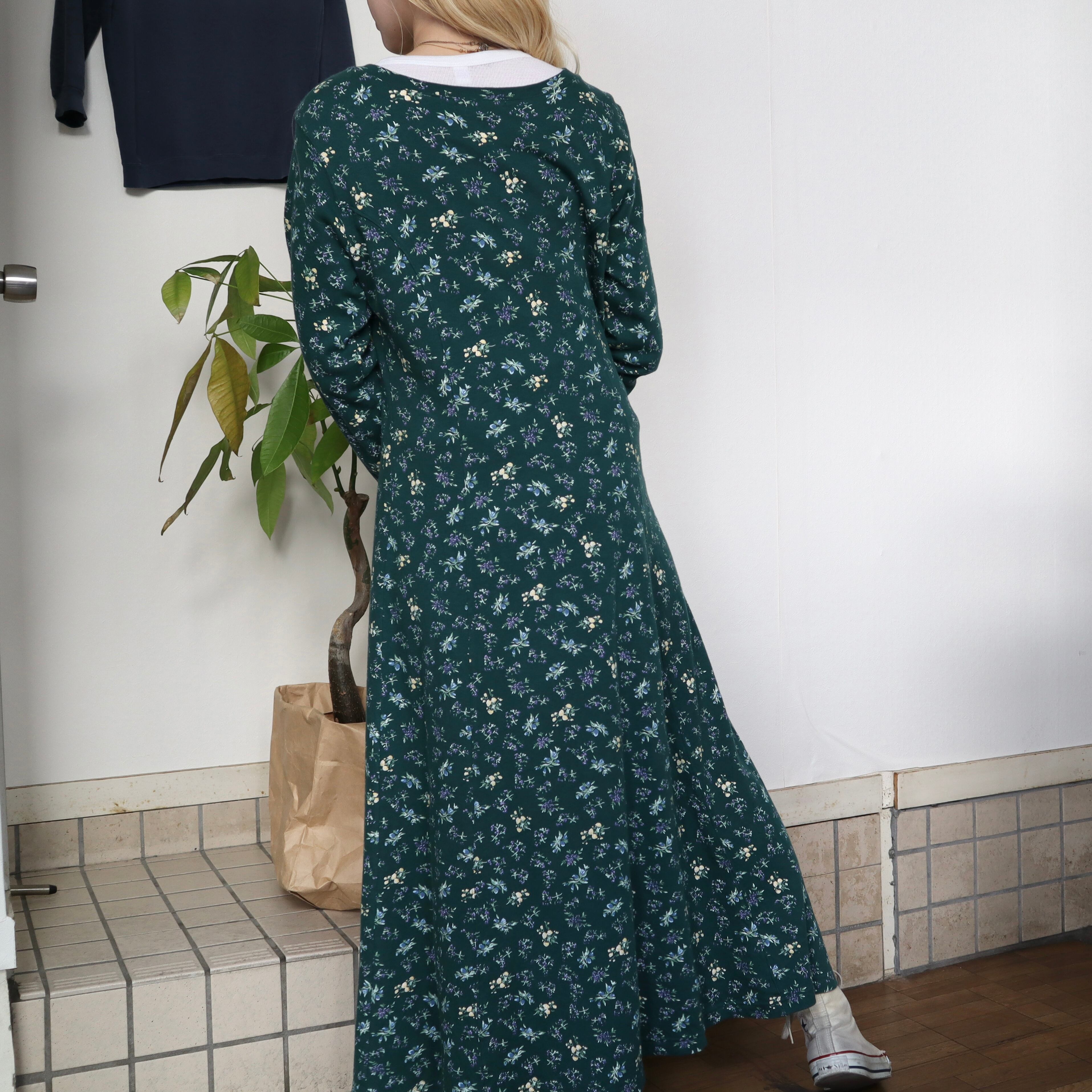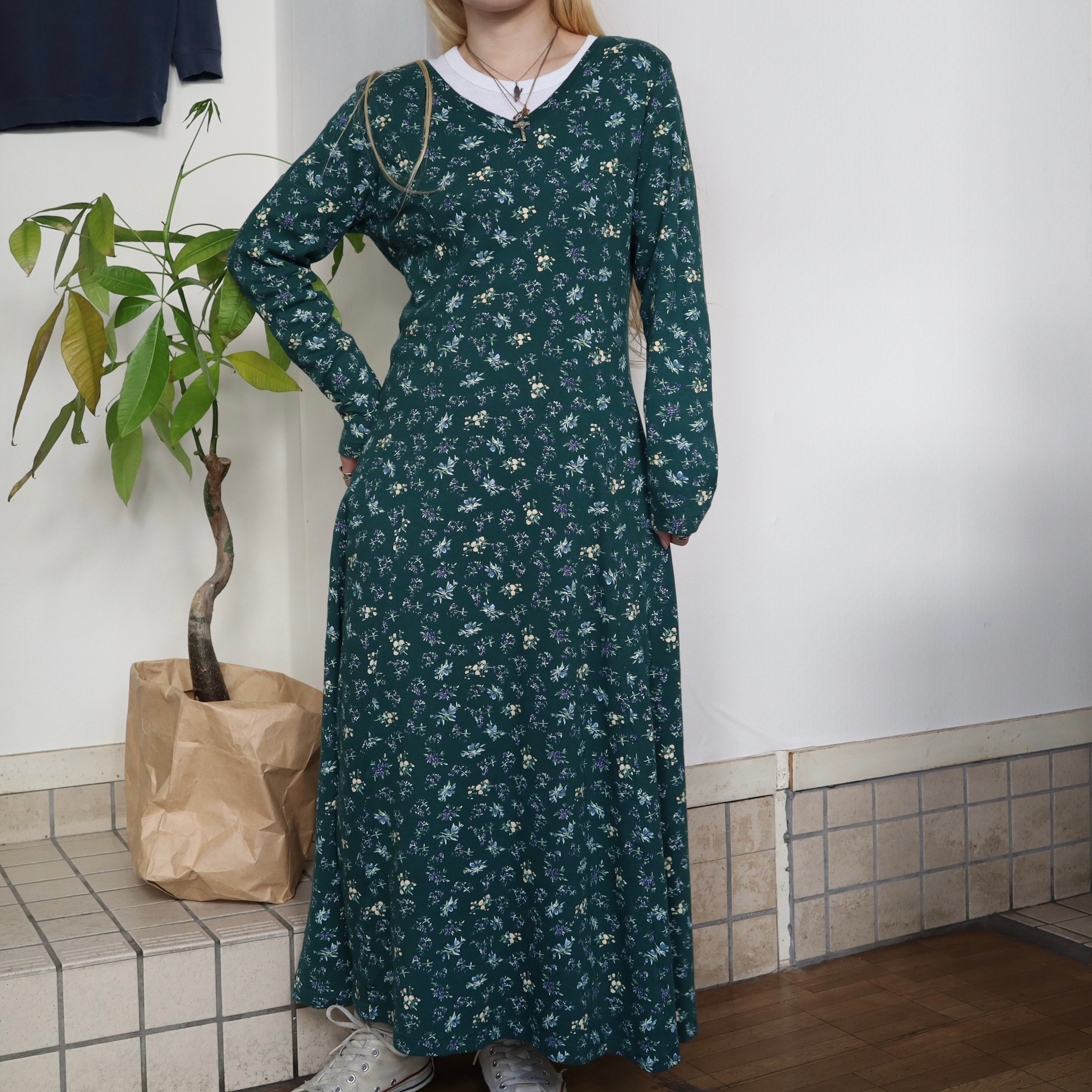 old flower long sleeve dress / green