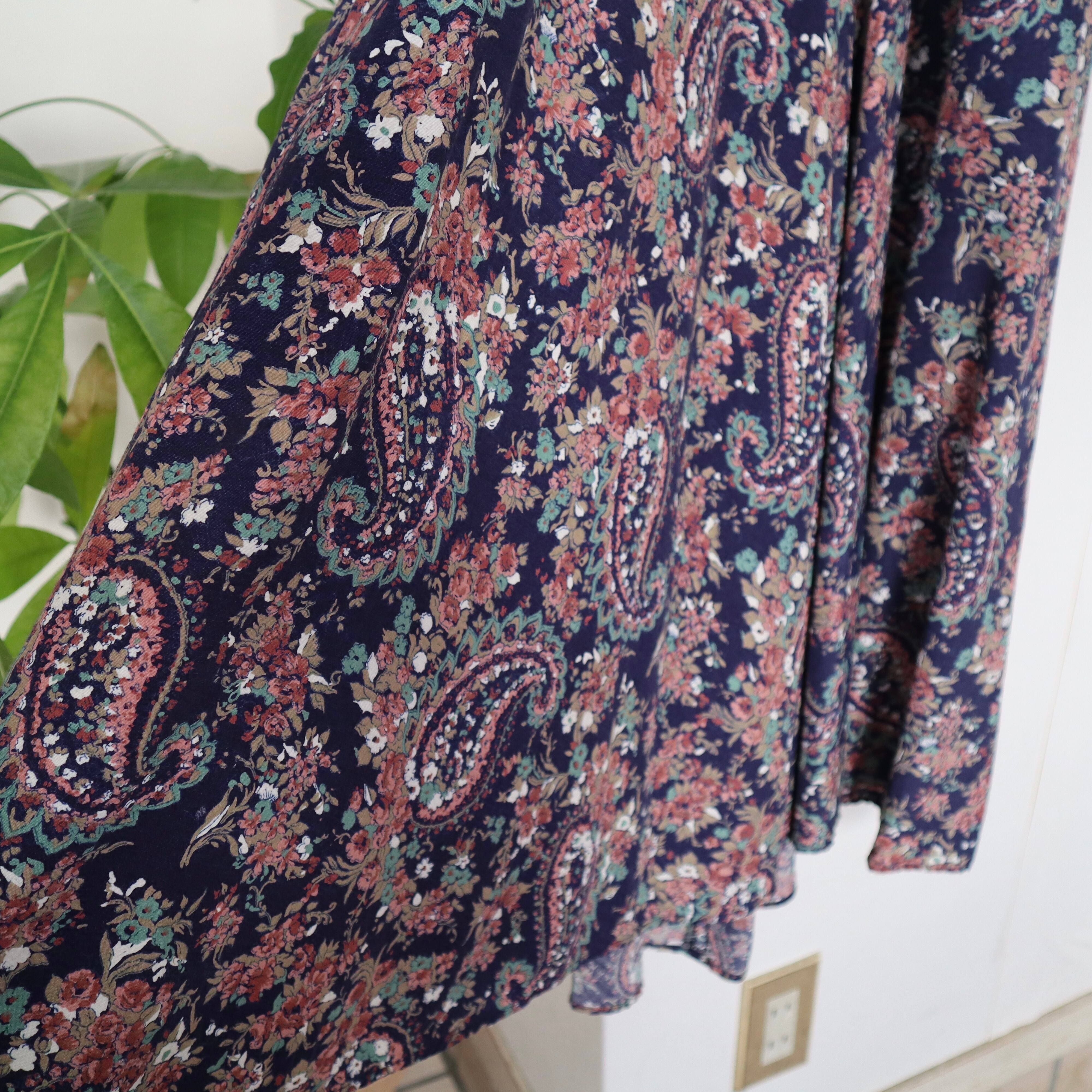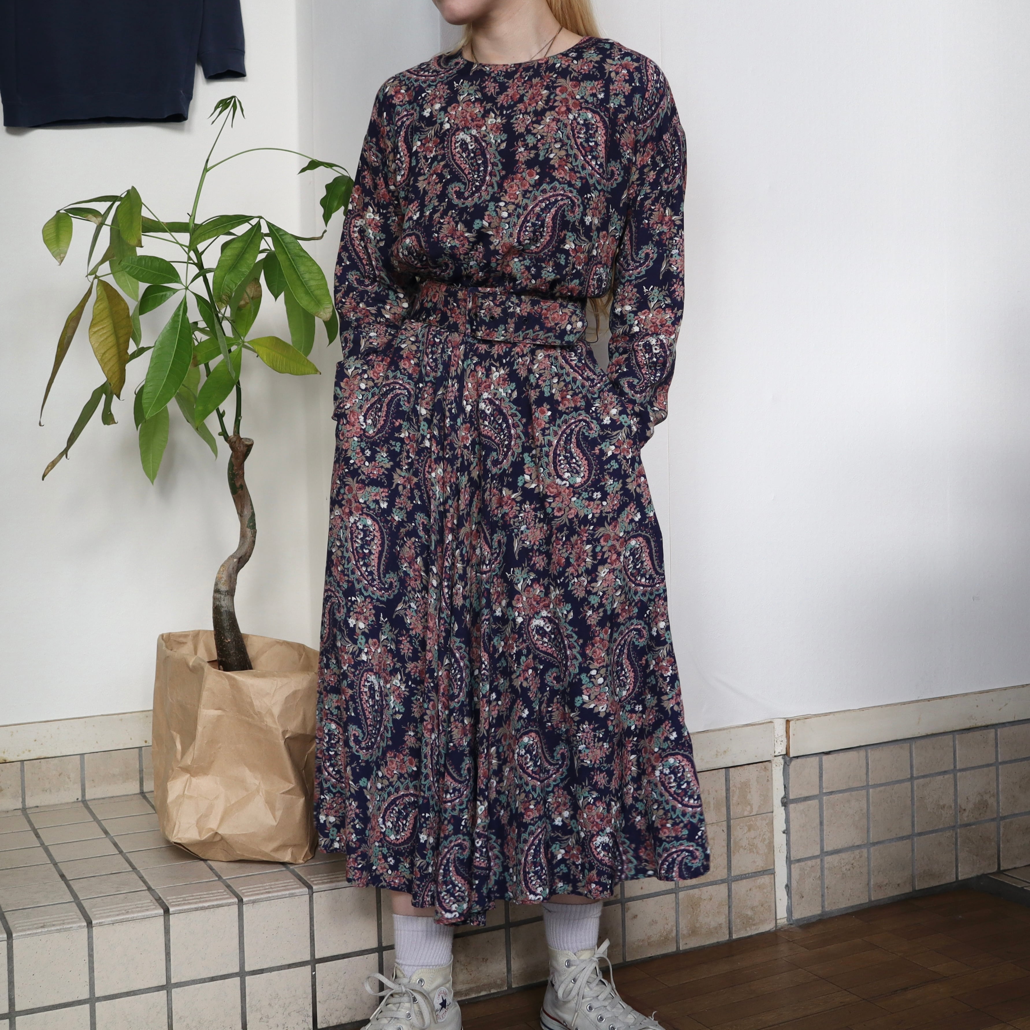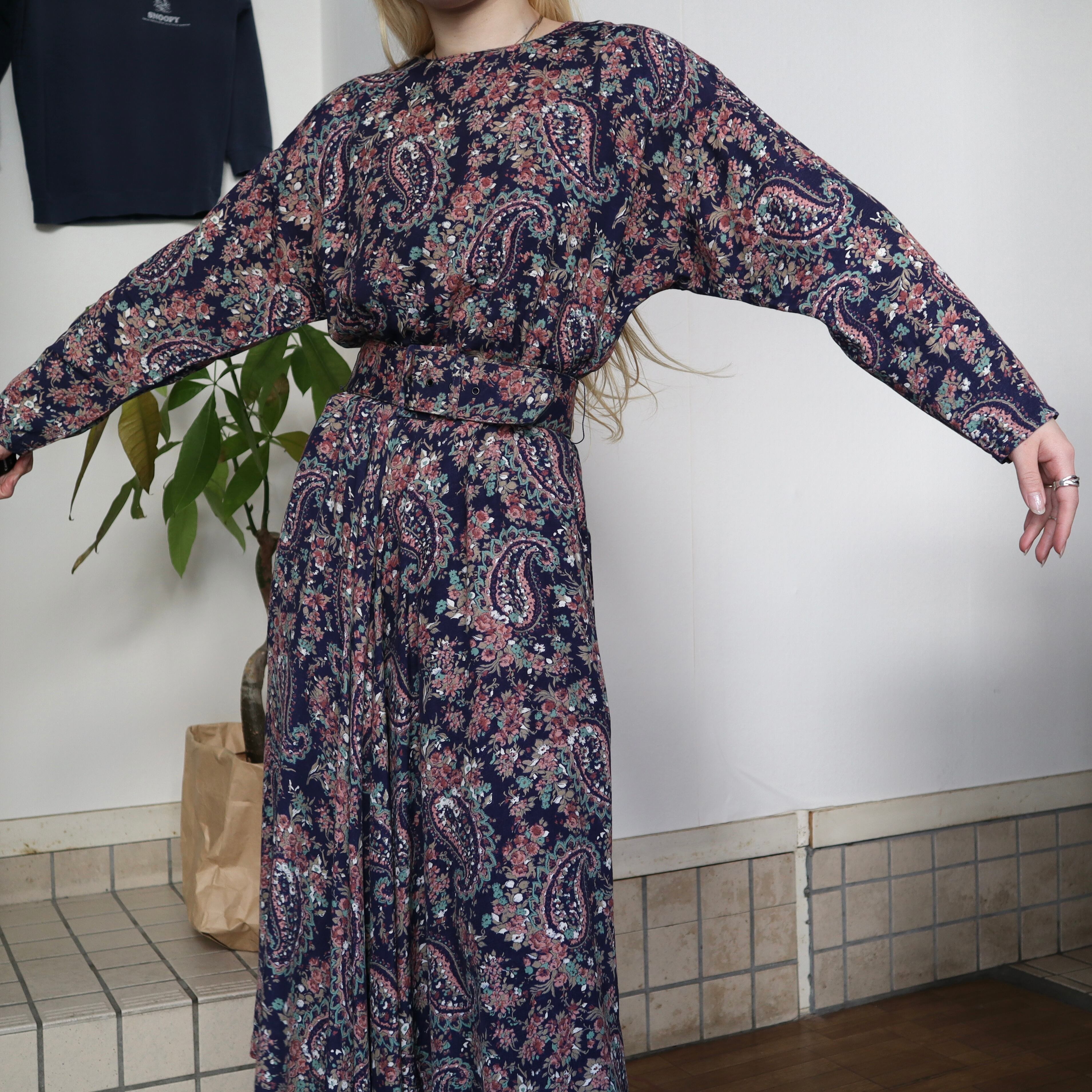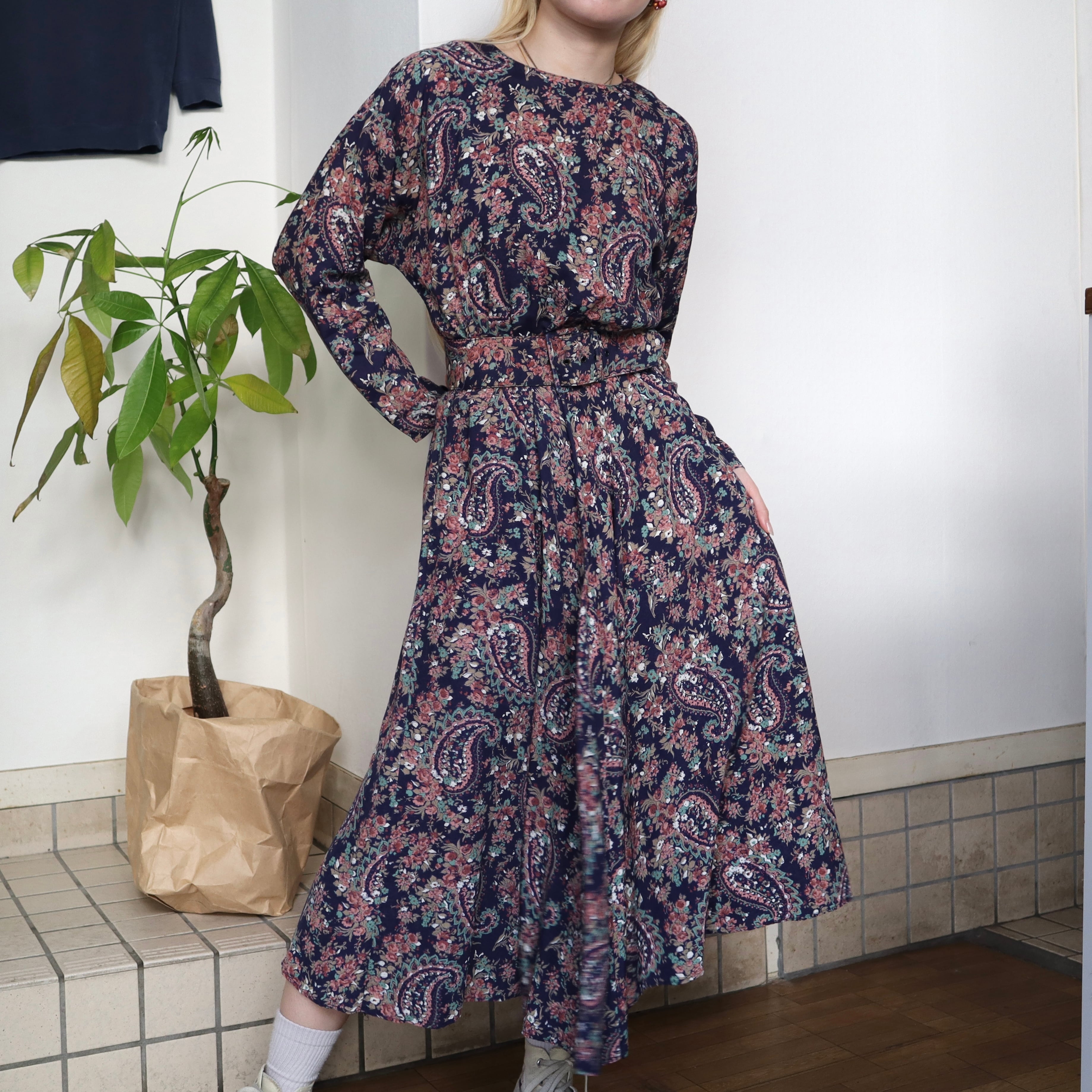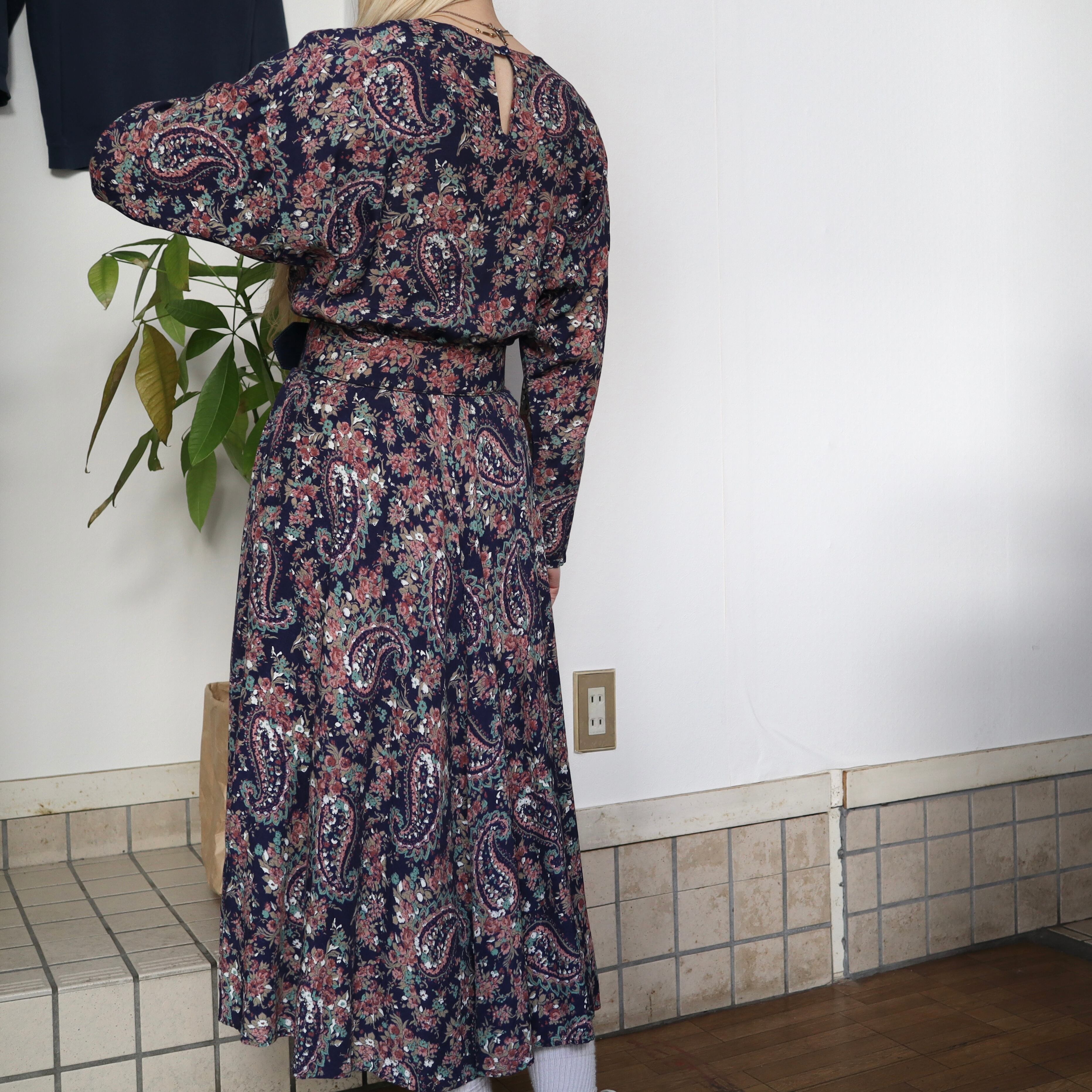 ネイビーベースに、全面に花柄とペイズリー柄がプリントされているワンピースです。