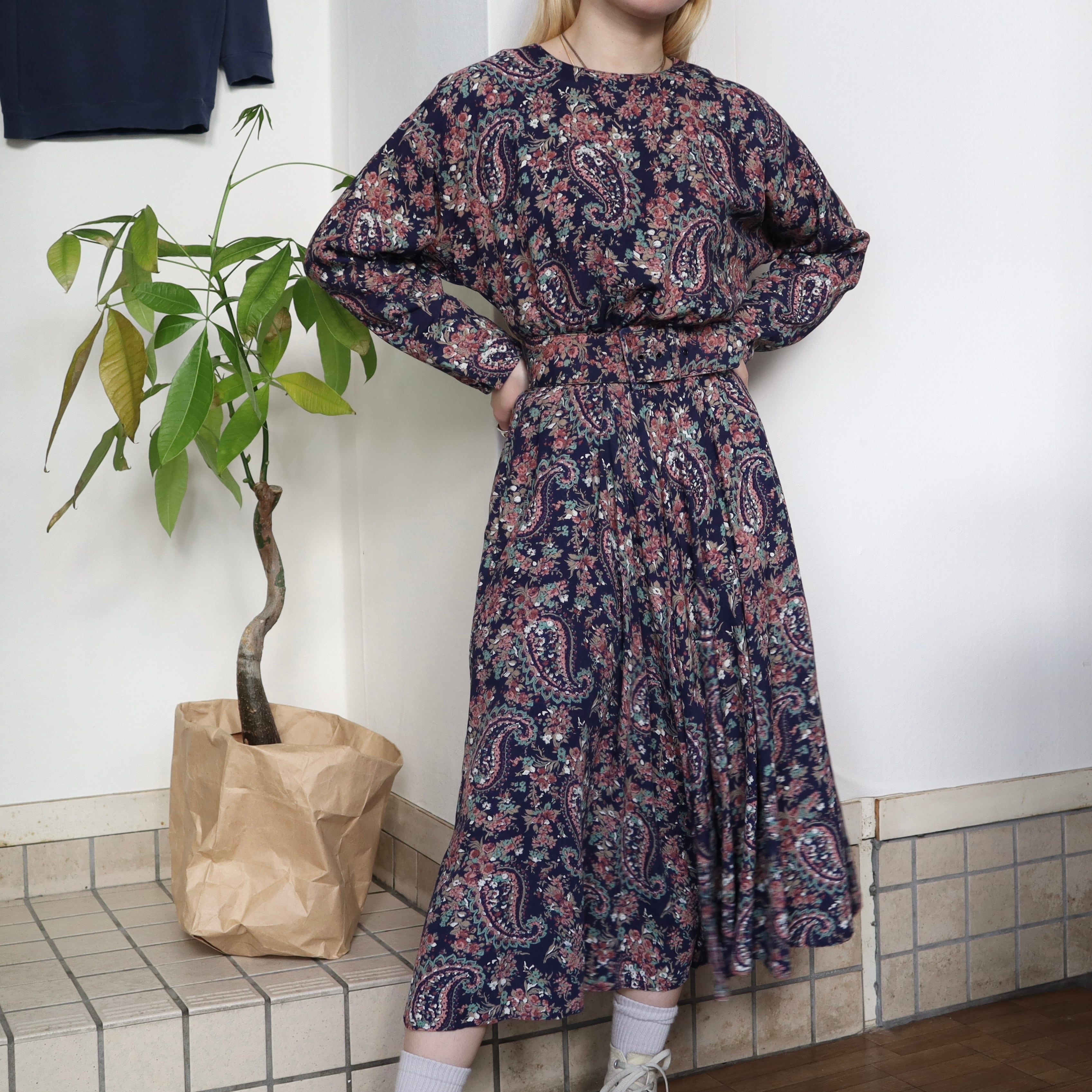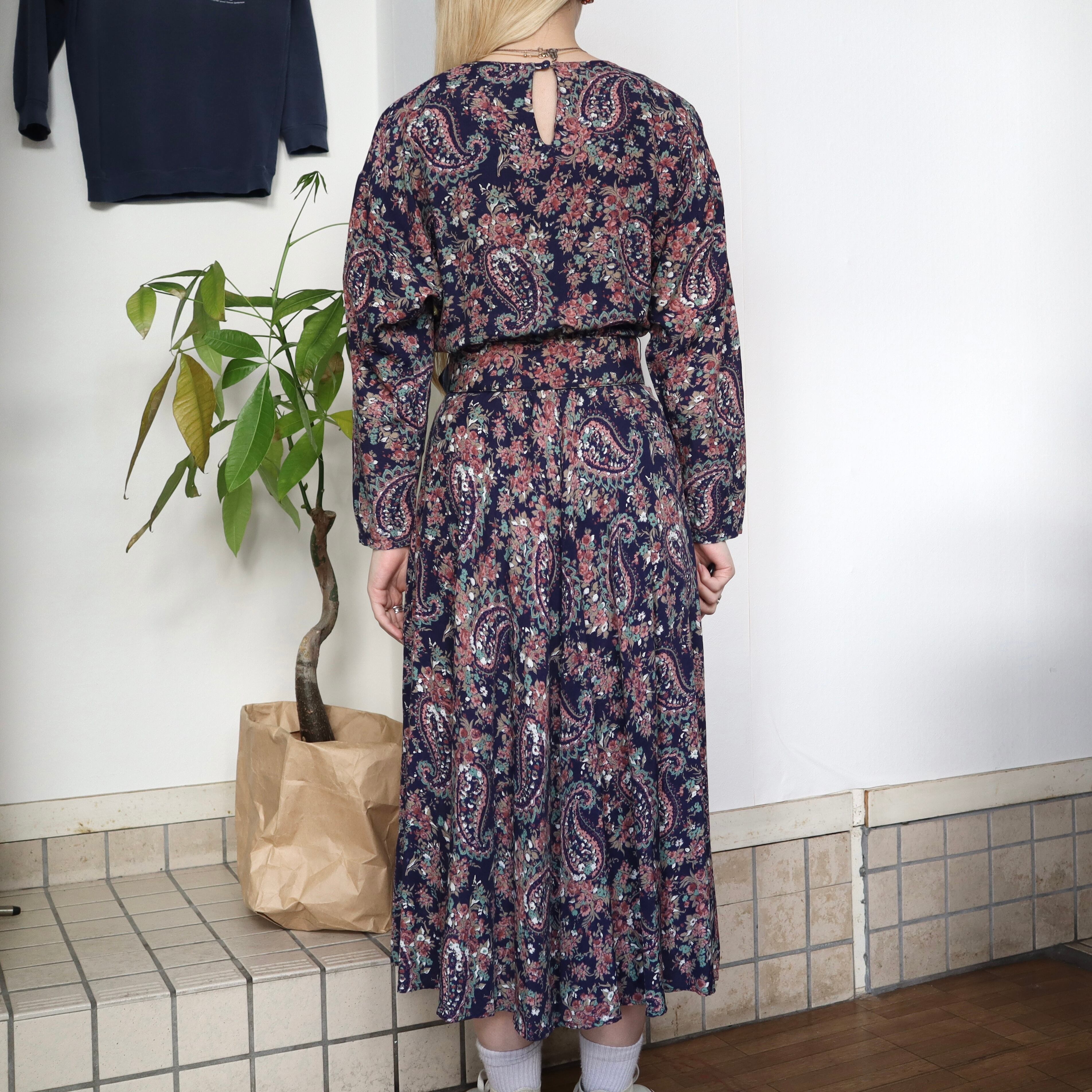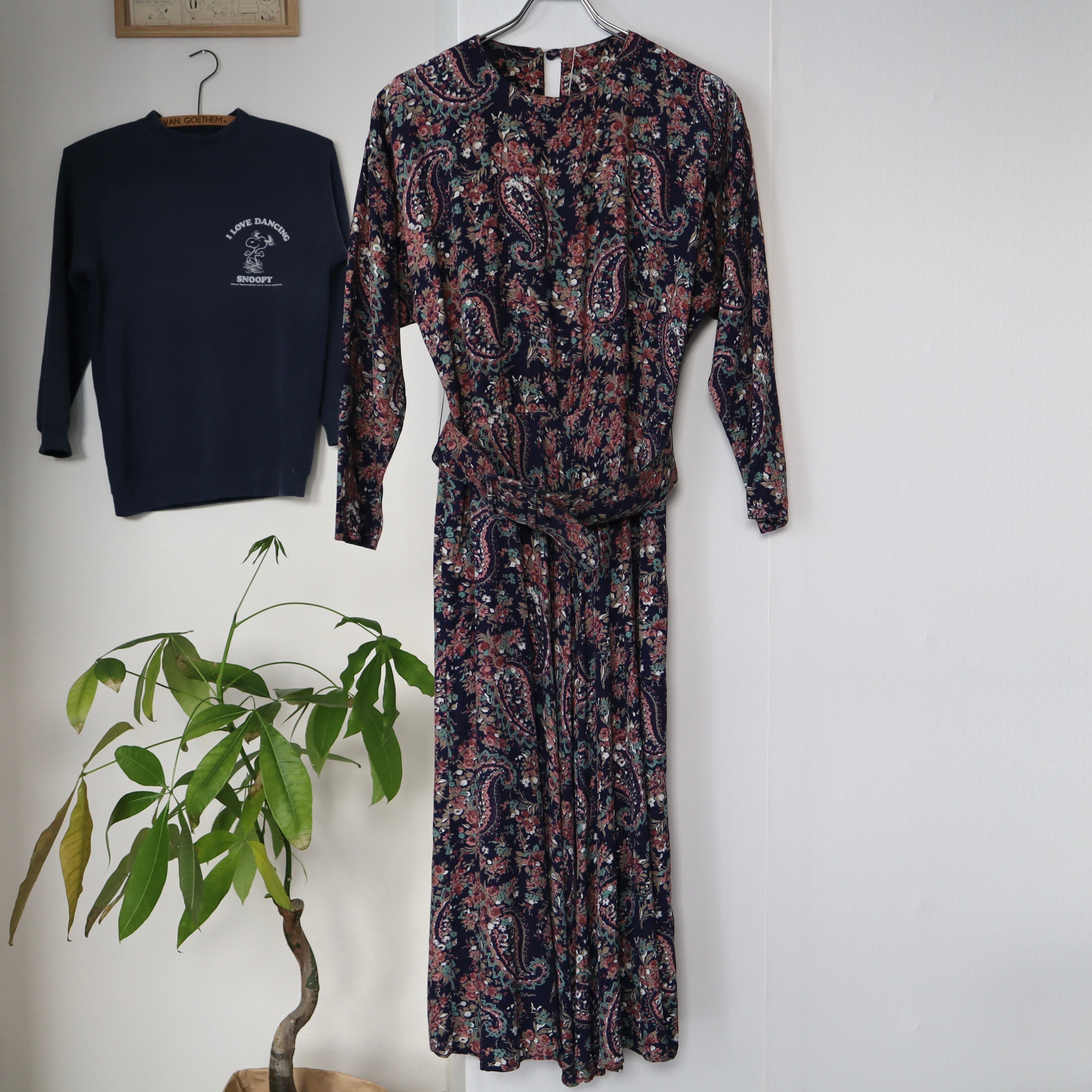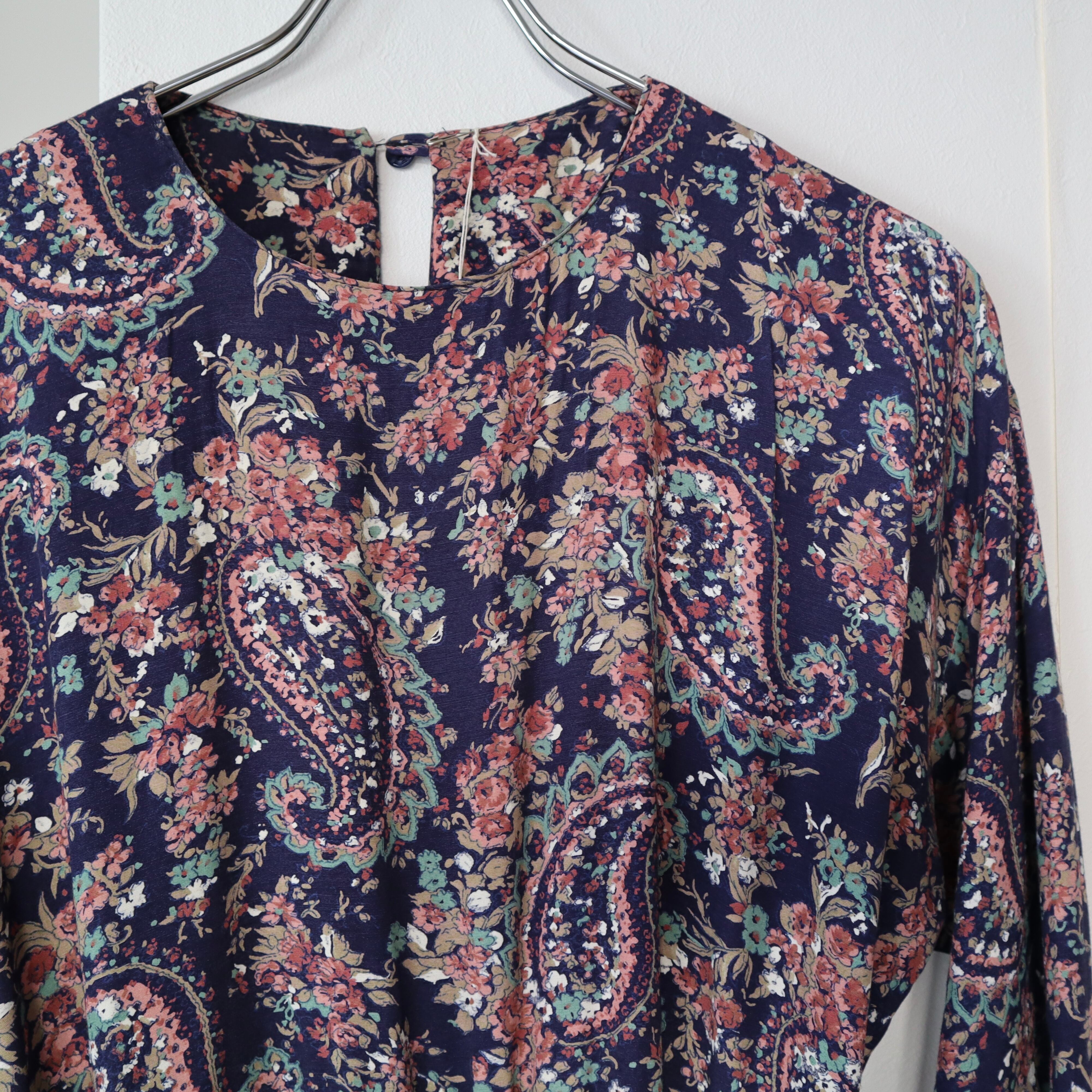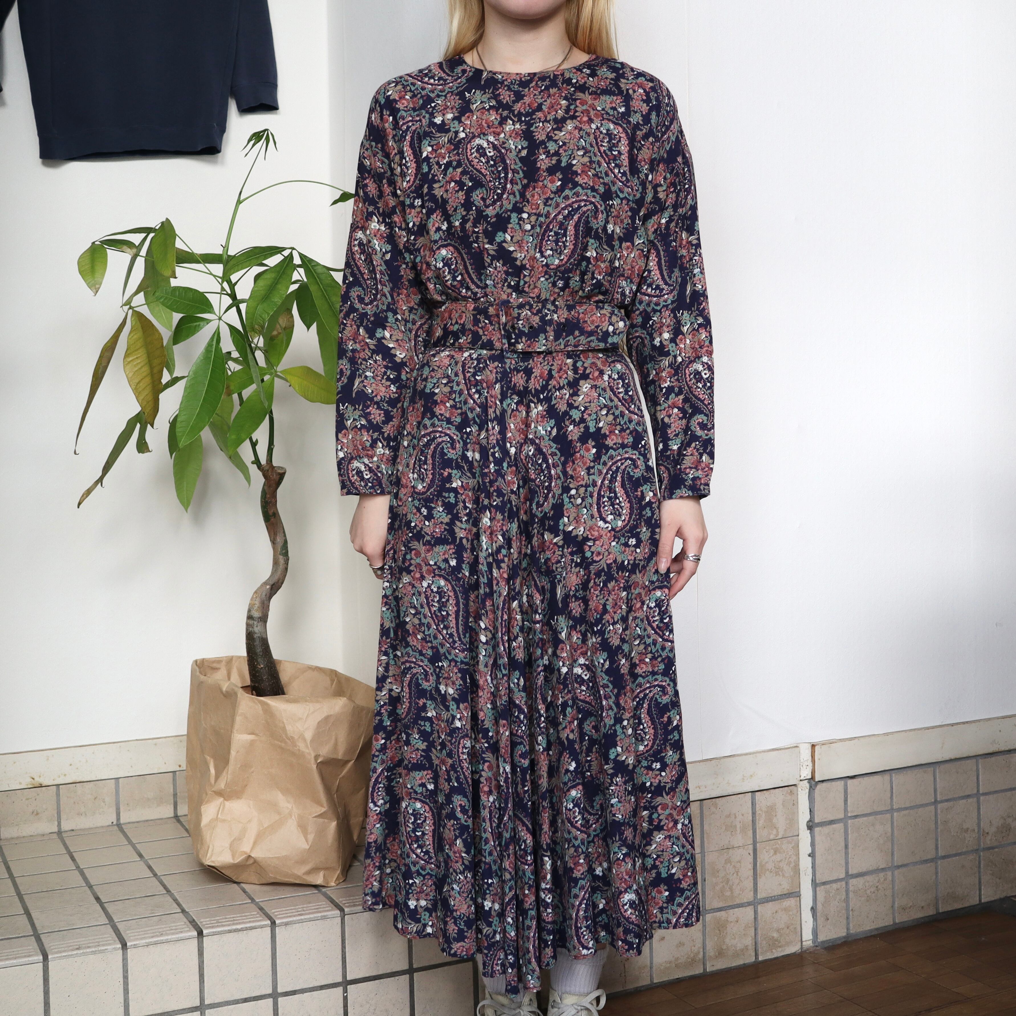 ネイビーベースに、全面に花柄とペイズリー柄がプリントされているワンピースです。