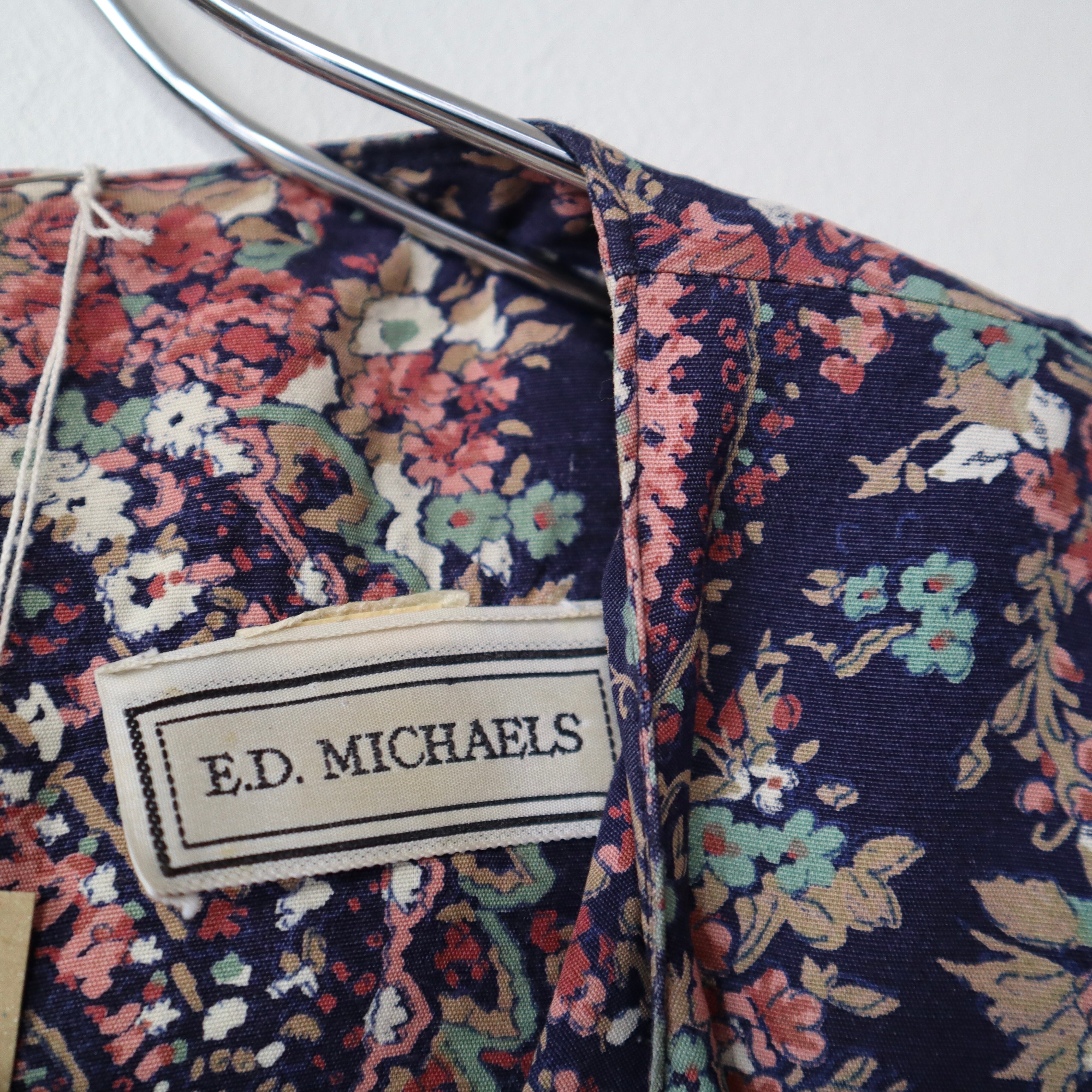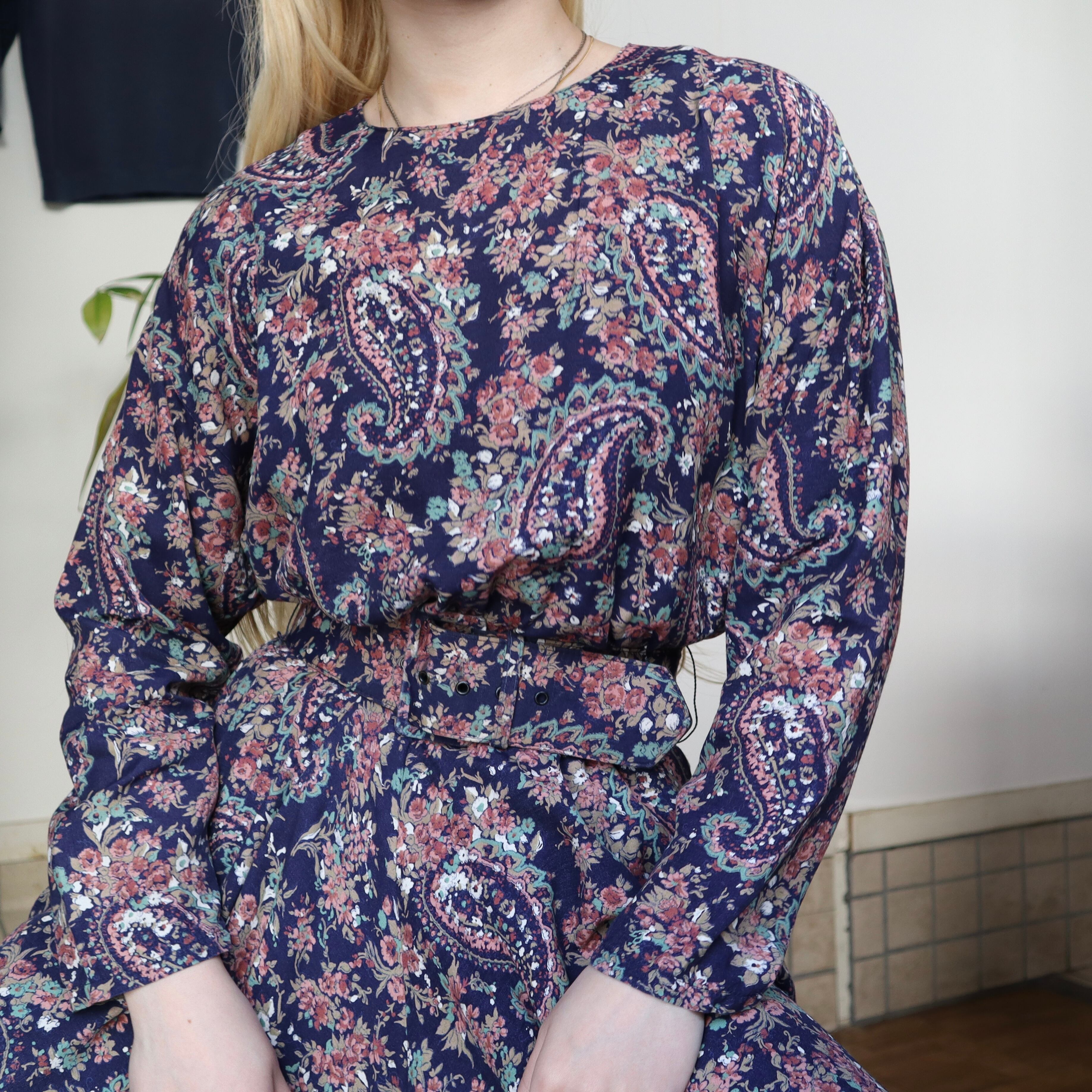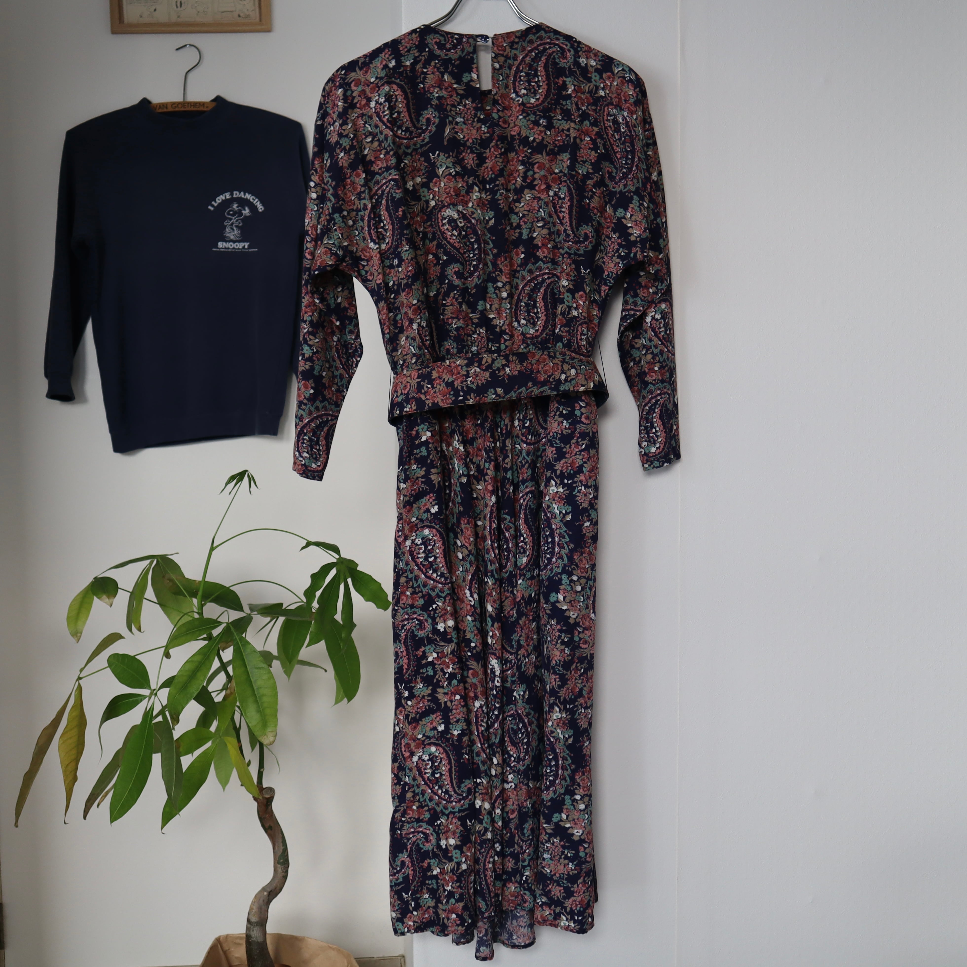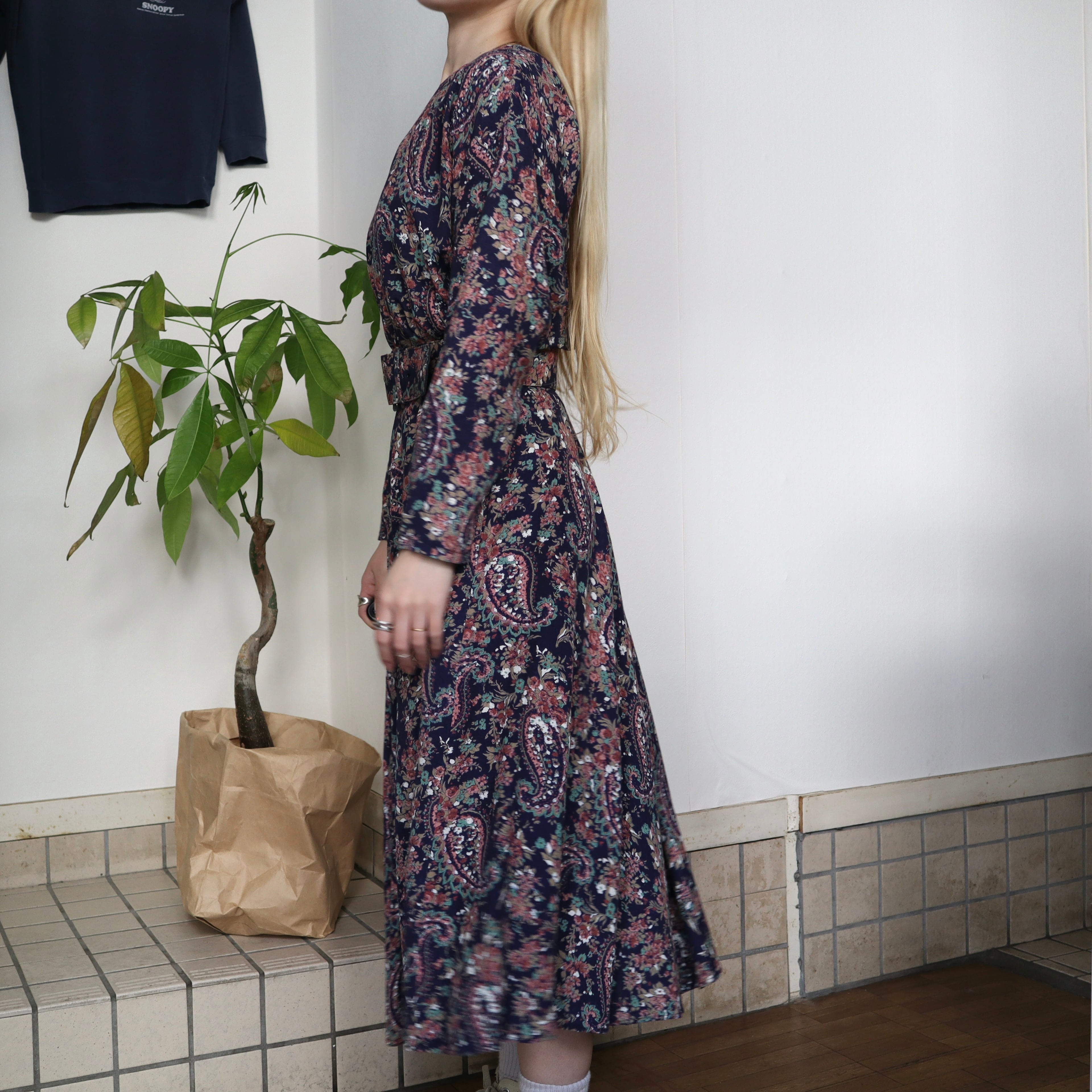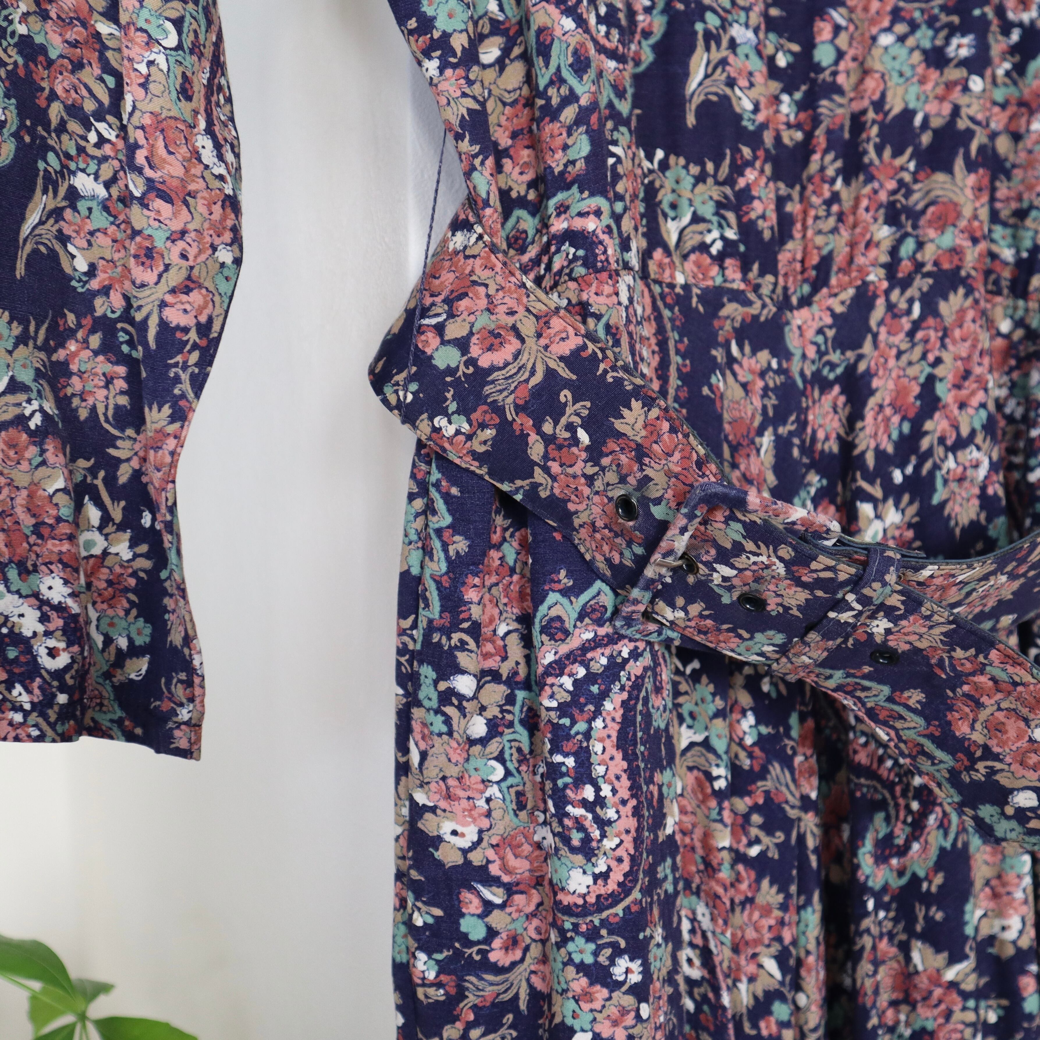 ネイビーベースに、全面に花柄とペイズリー柄がプリントされているワンピースです。