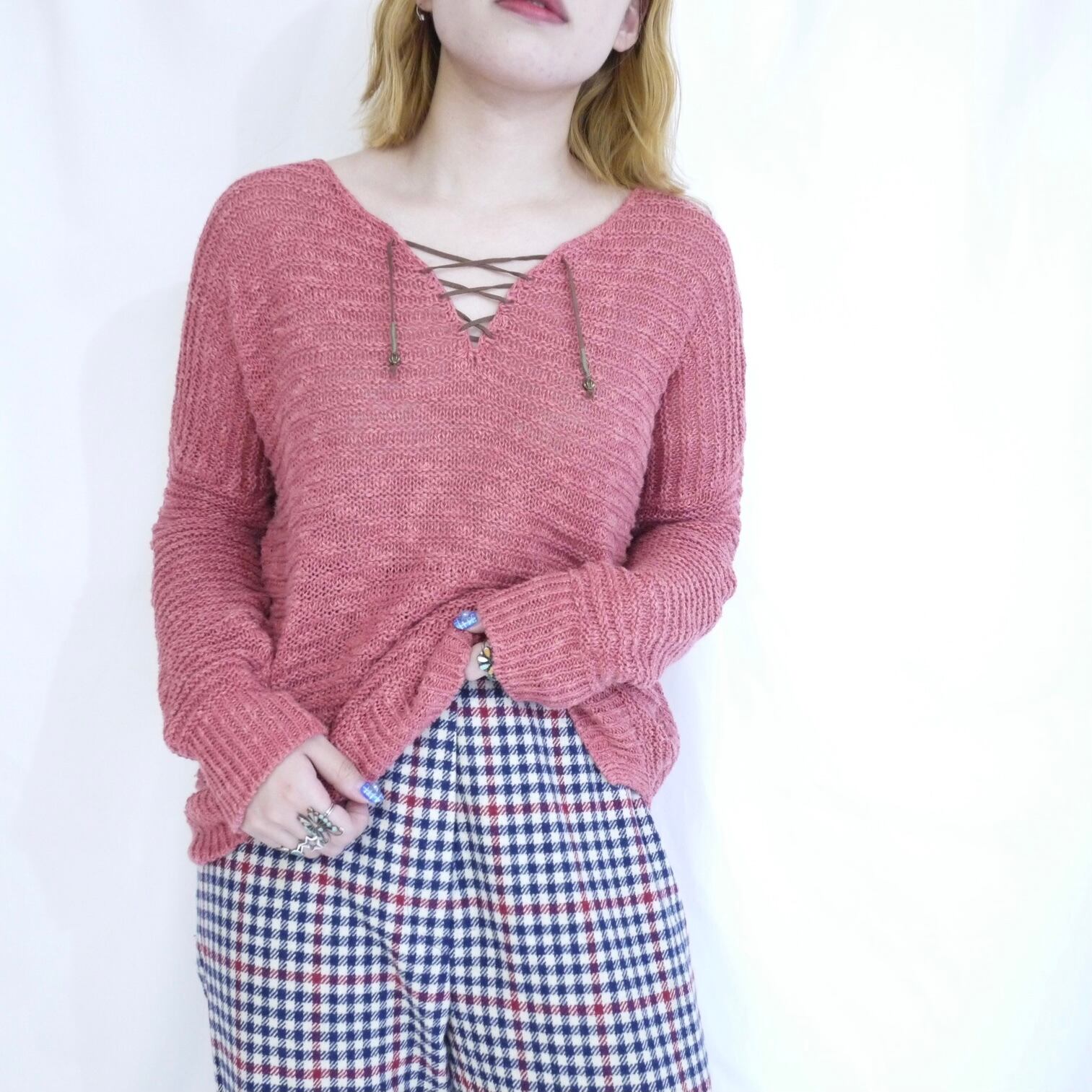 胸元はレザーの紐でレースアップになっていて、可愛らしいピンクカラーです。
