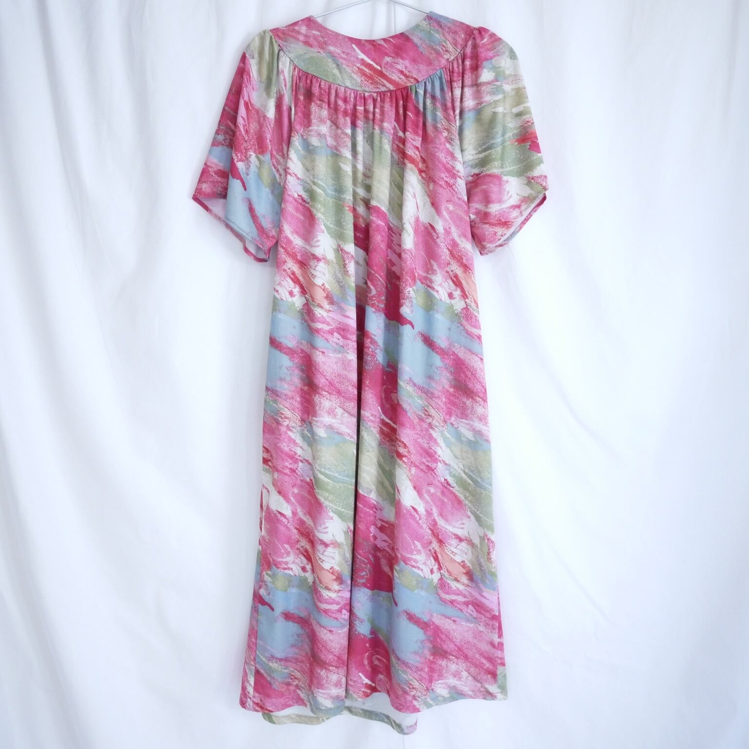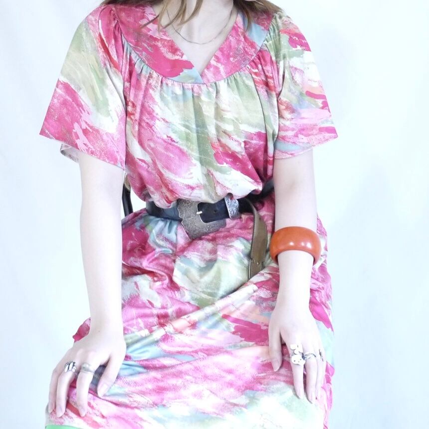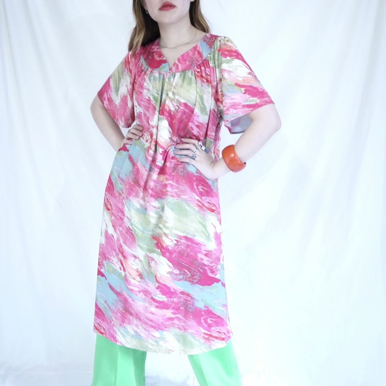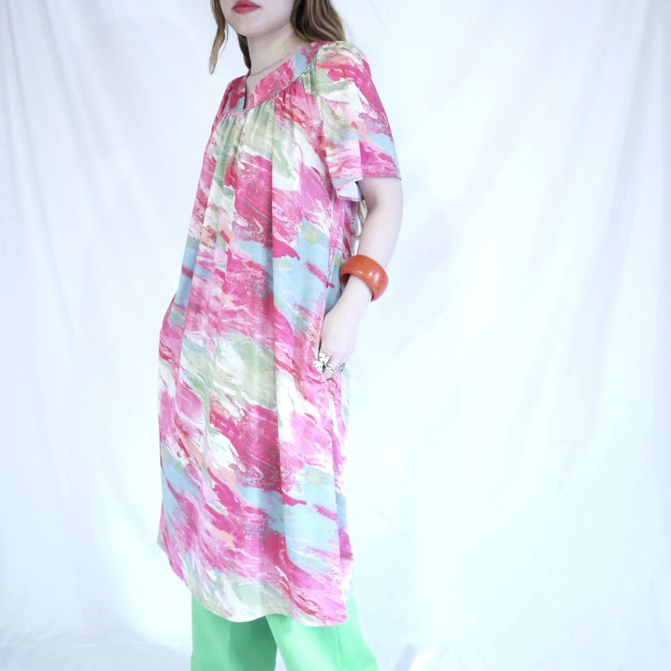 ピンクをベースに様々な色が入っていて、色合わせが楽しめそうなワンピースですね。