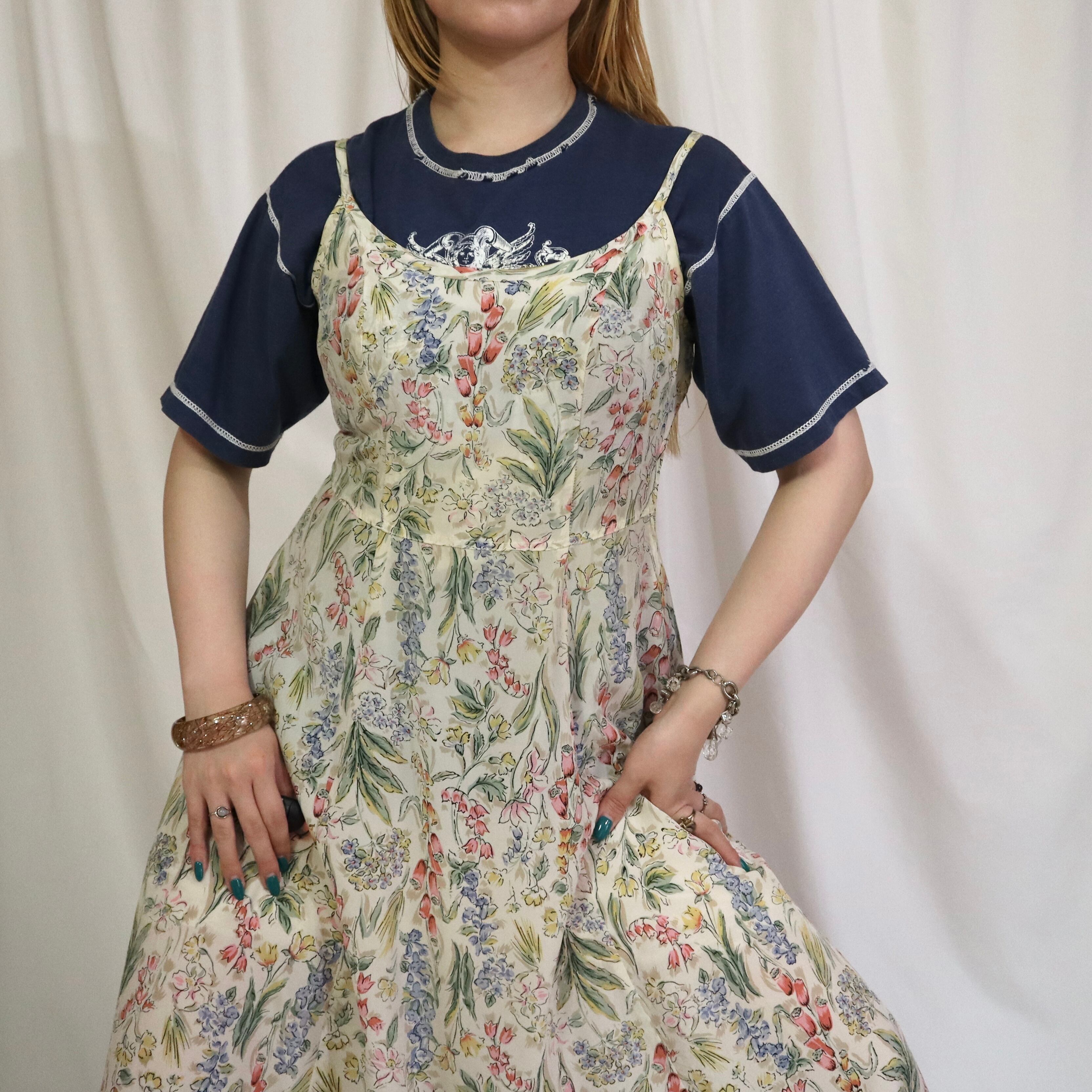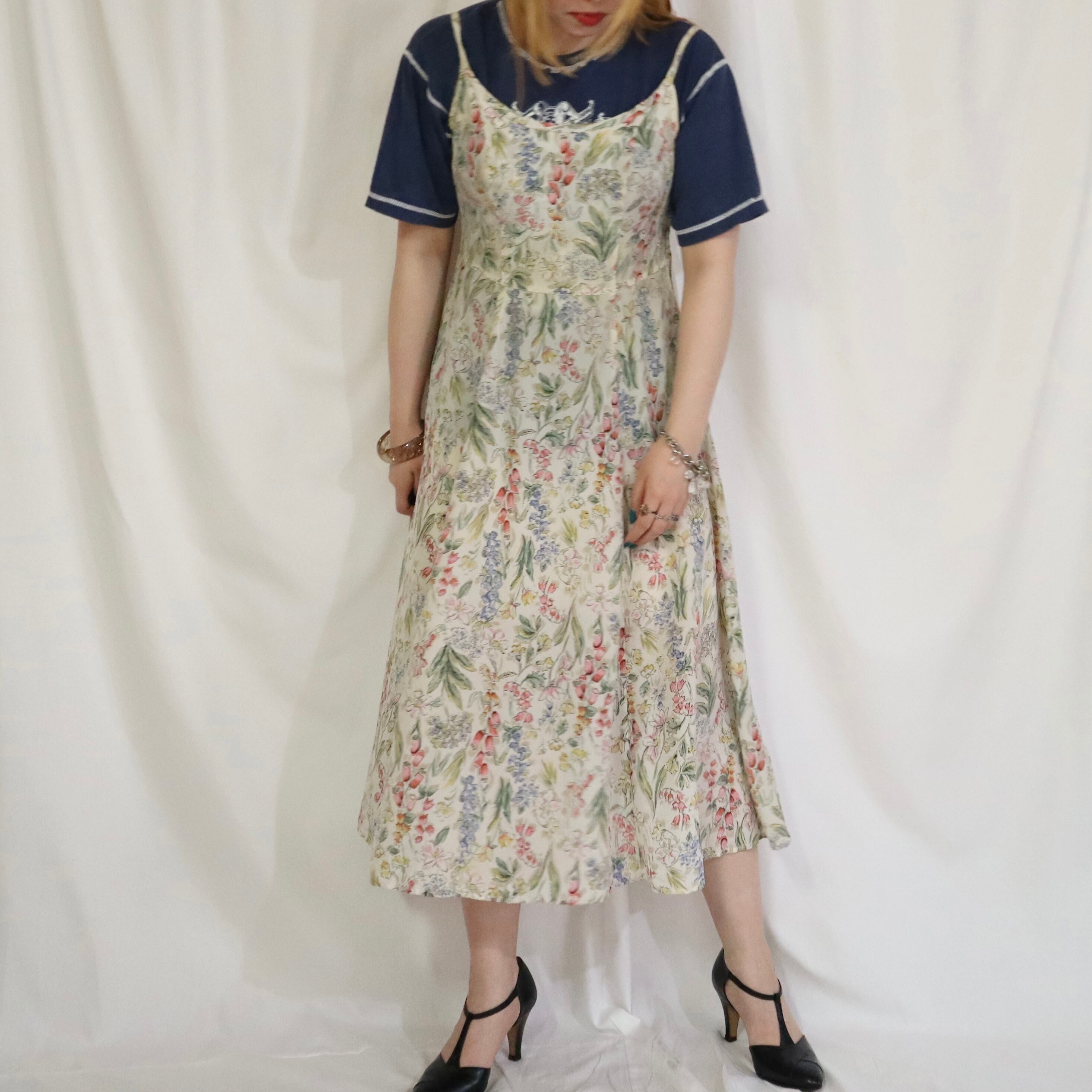 重ね着に使いやすいキャミソールの総柄ドレスです。