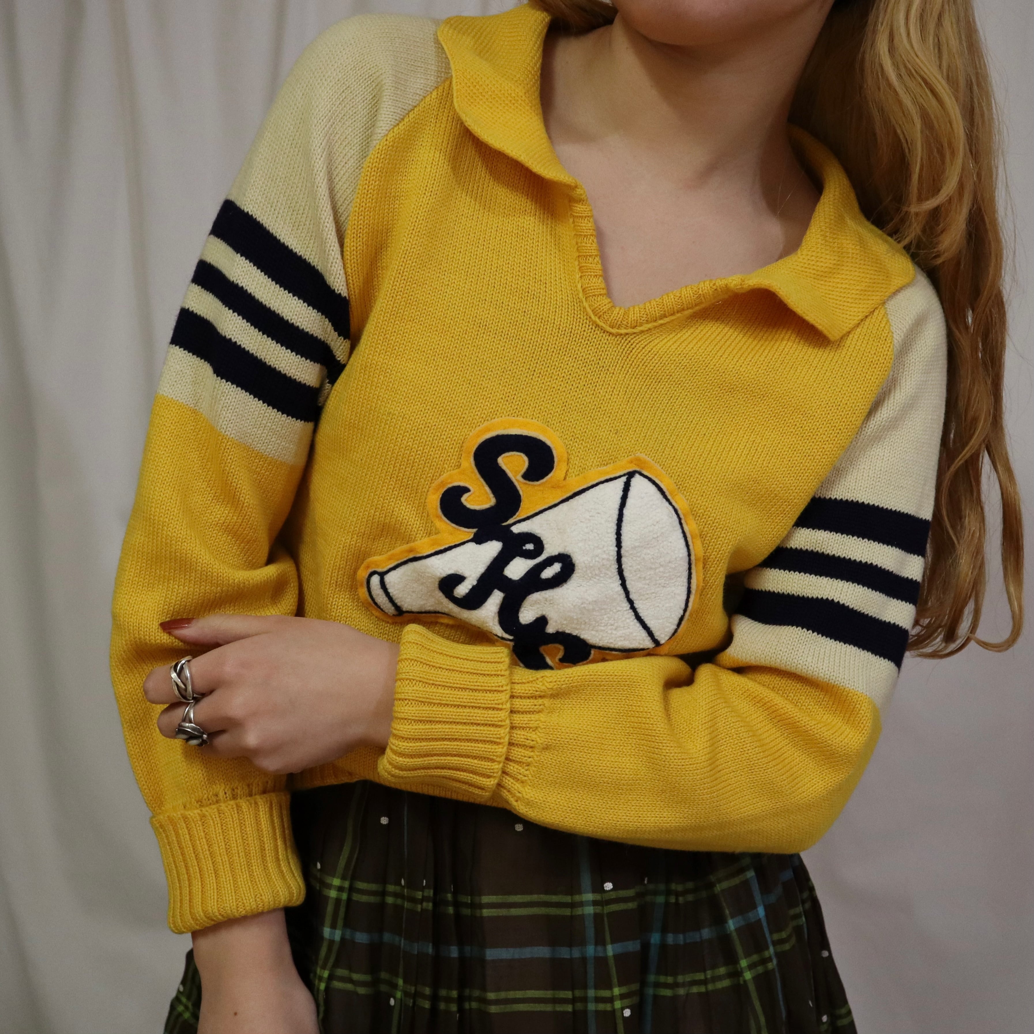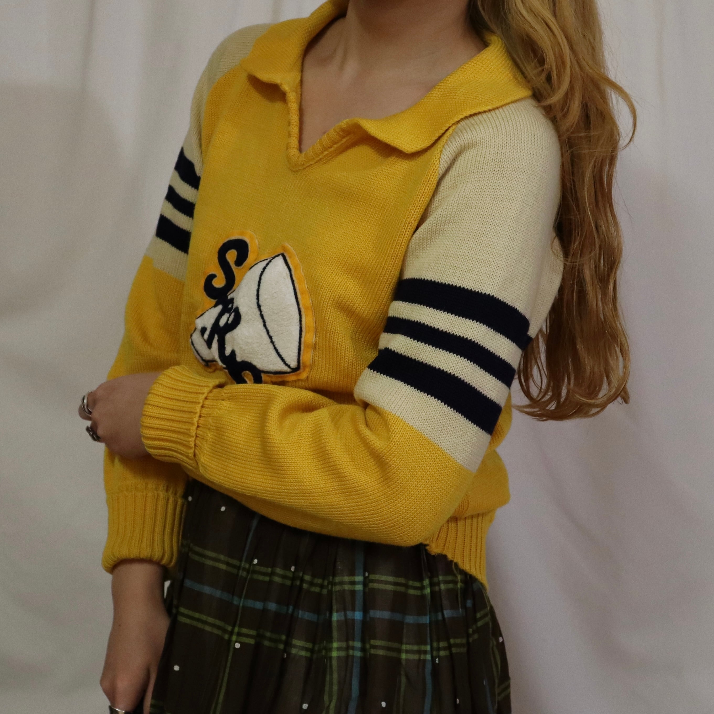 イエロー、ホワイト、ネイビーの配色がハッピーでとても可愛いニットです。