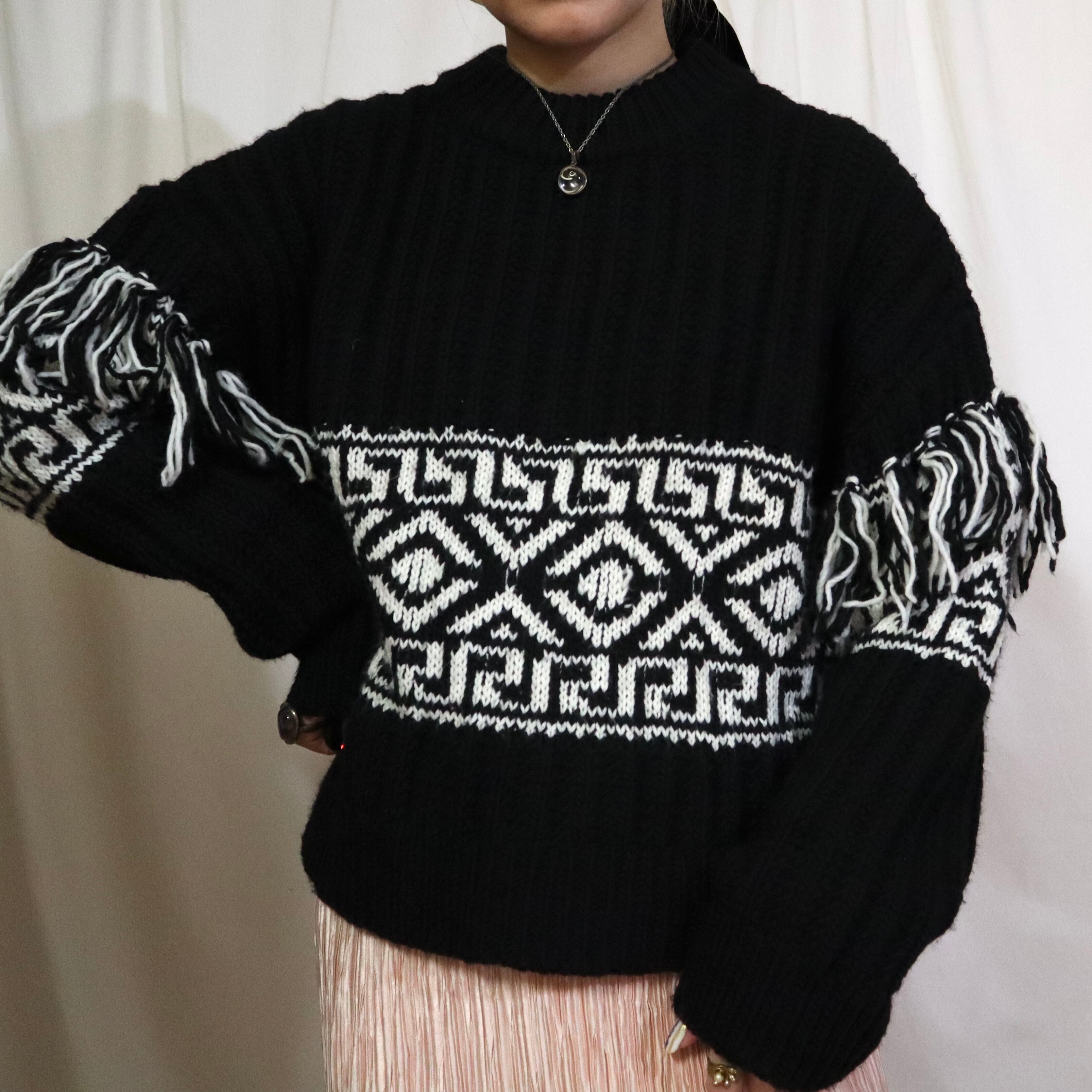 袖にぐるりと一周フリンジが付いていて、幾何学模様の切替になっています。